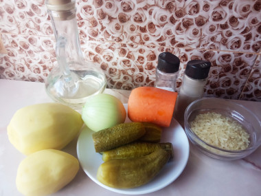 Калорийность продуктов: Курица, Картошка, Лук, Морковь, Соленые огурцы, Рис, Вода, Растительное масло, Соль, Специи сухие