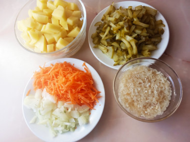 Как сварить рассольник с рисом классический? Подготовьте все необходимые ингредиенты. Для бульона можно использовать любые части курицы. Подготовим овощи. Лук очистите от шелухи. Морковь и картофель вымойте в проточной воде с щеткой, очистите от кожуры и ополосните в воде. Рис промойте несколько раз, чтобы вода от него оставалась прозрачной.