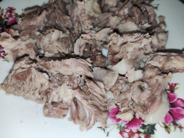 Курицу промойте в проточной воде и выложите в кастрюлю. Залейте холодной водой, поставьте на огонь и доведите до кипения. Варите в кипящей воде, в течение 30 минут. При закипании будет образовываться пена, которую необходимо снимать. Затем курицу извлеките из кастрюли с помощью шумовки, немного остудите и отделите мясо от костей.