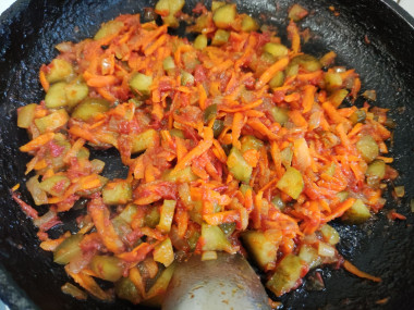 Огурцы нарежьте мелким кубиком или другим привычным вам способом. Добавьте к зажарке, обжарьте все вместе еще пару минут и снимите с огня.