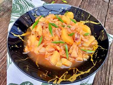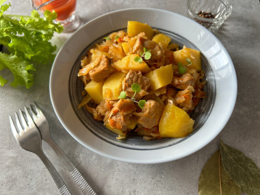 Моя бабушка называла такое сочетание продуктов солянкой и мне эта солянка безумно нравилась. Правда у меня так же не получается, но это блюдо готовлю с удовольствием. На этот раз вместо свинины взяла куриные окорочка, сняла с них мясо и мелко нарезала. Готовила Рагу с капустой картошкой и мясом в казанке. Сначала обжарила мясо с луком и морковью, а затем заложила капусту и потушила минут 10, т.к. капуста у меня была жесткая. Потом уже картошку добавила и специи. Из специй взяла черный перец, паприку и овощную приправу. Получилось очень вкусное рагу с томатной подливкой. Все овощи стали мягкими, пропитались мясным соком и пряностями. Ароматный горячий ужин получился.