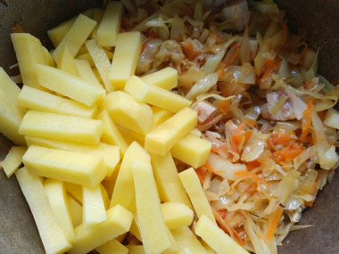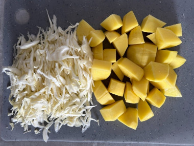 В это время подготовьте капусту и картофель. Капусту нашинкуйте, а картофель нарежьте крупными кусочками.