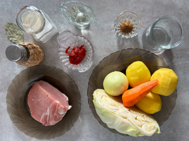 Как сделать рагу с капустой, картошкой и мясом? Подготовьте для этого необходимые ингредиенты. Для приготовления можно использовать любой вид мяса. Я буду готовить из свинины. Пропорции можно немного поменять по своему вкусу в ту или иную сторону. Картофель очистите и ополосните.