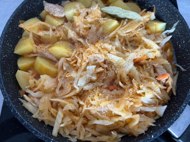 По вкусу подсыпьте немного соли и специи. В качестве специи можно ограничиться молотым перцем. Всё перемешайте, накройте крышкой и тушите на небольшом огне 20-25 минут. Количество жидкости регулируйте на свой вкус.