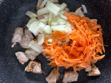 Отдельно очистите от кожуры лук и морковь и ополосните их от загрязнений. Лук мелко нарежьте, а морковь натрите на крупной терке. Добавьте лук и морковь в сковороду к мясу. Обжаривайте все вместе еще 2-3 минуты. За это время от овощей появится приятный аромат.