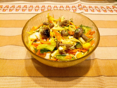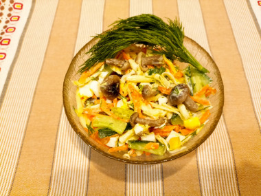 Вкусный и простой в приготовлении салатик. Спасибо! Кому нужен более сытный вариант предложу вот такой куриный салат с маринованными грибами и фасолью. Самодостаточное блюдо.