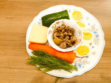 Интересный, необычный рецепт с маринованными грибами. Очень понравилось, что в составе свежий огурец и свежая сочная морковка. Они дают достаточно вкусного и полезного сока. Благодаря этому майонеза я взяла чуть меньше столовой ложки, а продуктов брала гораздо больше, чем у автора. У меня был довольно крупный огурец, 2 яйца и среднего размера морковка. Сыра и грибов я взяла примерно по 100 гр. Салат получился очень сочный, с пикантным свежим вкусом. Спасибо за рецепт Салат огурцы грибы сыр!