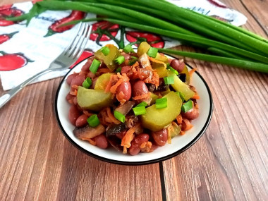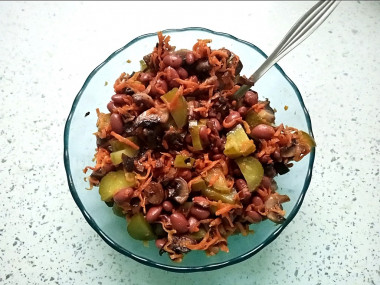 Лук, грибы и морковь обжарила на растительном масле и сдобрила смесью из мельнички (морская соль, горчица, смесь перцев, паприка). Сильно солить не советую, т. к. огурцы и фасоль уже содержат соль.