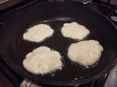 На горячую сковороду налейте немного растительного масла и выкладывайте тесто. Пеките оладьи на небольшом огне по 1-2 минуты с каждой стороны. Они должны успеть пропечься внутри. Как выбрать сковороду читайте в статье в конце рецепта.