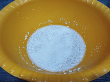 Затем влейте в чашу кислое молоко и разбейте яйцо. Все смешайте с помощью венчика. Яйцо предварительно вымойте с содой, так как на нем могут быть вредные бактерии.
