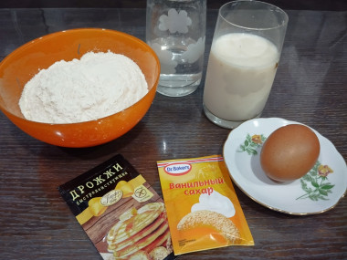 Калорийность продуктов: Кислое молоко, Вода, Сухие дрожжи, Сахар, Пшеничная мука, Яйца, Растительное масло, Соль, Ванилин