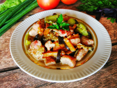 Приготовила на обед мясо тушёное с баклажанами.