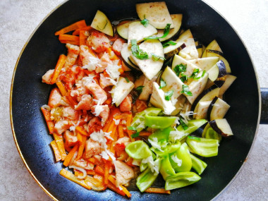 После этого выложила в сковороду болгарский перец и баклажаны, добавила мелко нарезанный базилик (кориандр не добавляла). От себя добавила натертый на мелкой терке чеснок для аромата. Тушила под крышкой еще минут 15.