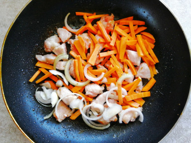 3. Лук и морковь очищаем, лук режем кубиками, морковь - кружочками. Отправляем овощи к мясу, продолжаем жарить в течение еще 3 минут.
