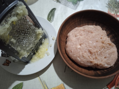 Для приготовления фарша я использую мелкую решётку, если такой нет, то можно фарш пропустить два раза чрез мясорубку с решёткой, которая есть. Измельчите в мясорубке нарезанное куриное филе, репчатый лук и размокший в молоке хлеб (если осталось молоко, то его тоже пустите в фарш).