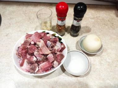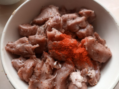 Сложить мясо в миску, насыпать соль и специи. Перемешать и оставить на 20 минут.