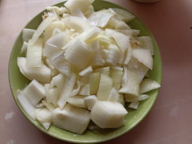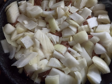 Мясо порезала небольшими кубиками, выложила в тарелку, добавила соль,перец и перемешала. Лук порезала полукольцами.