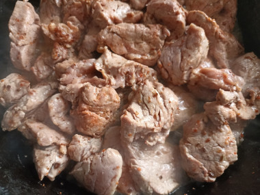 Выложила мясо в разогретую сковороду с растительным маслом.