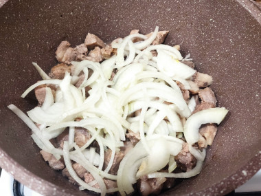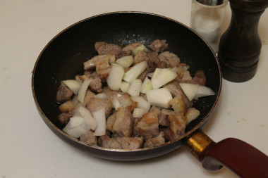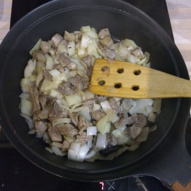 Мясо с луком жарить на медленном огне в течение 30 минут. Его нужно периодически перемешивать.