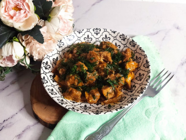 Обжарила немного и затем добавила лук, перемешала и обжаривала до готовности мяса. Готовое мясо посыпала измельченной зеленью укропа.
