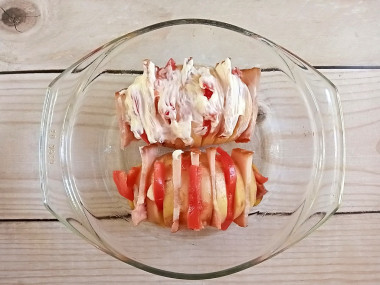 Картошку нафаршируйте в разрезы беконом и немного помидором - для красоты. Смажьте майонезом. Поместите в смазанную форму для запекания. Майонез можно сделать самостоятельно. Под шагами вы найдете ссылку на каталог рецептов домашнего майонеза.