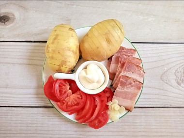 Как сделать картошку гармошку с беконом? Возьмите картошку, сыровяленый бекон, помидор, майонез, масло.