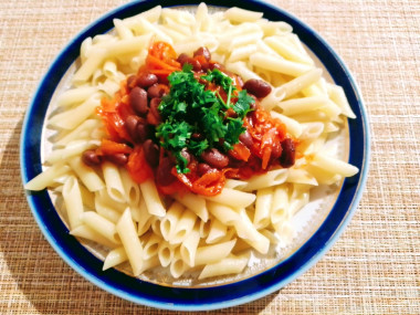 По желанию в фасоль с морковью и томатом можно добавить свежую зелень. На теплую тарелку выложите порцию макарон, сверху немного фасоли с морковью. Подавайте к столу!
