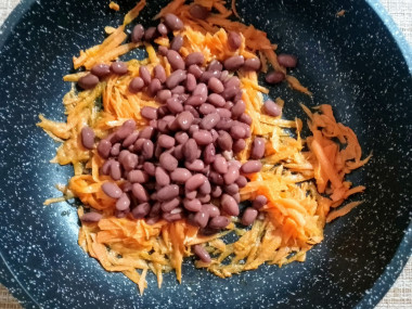 Разогрейте на сковородке масло с пряностями, добавьте морковь, слегка обжарьте до мягкости. Добавьте фасоль.