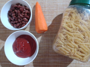 Подготовьте основные продукты для приготовления макарон с фасолью: макаронные изделия (например, спиральки, трубочки, рожки, ракушки), готовая консервированная фасоль, морковь, томатная паста, масло топленое, пряности.