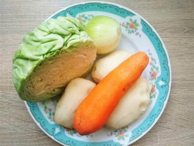 Как сварить овощной суп со свежей капустой, картошкой, морковью и луком? Подготовьте необходимые ингредиенты. Все овощи вымойте и очистите. По желанию можно также добавить болгарский перец. Чтобы суп получился более наваристым и сытным, можно сварить его на мясном бульоне или добавить кусочки вареной курицы или фрикадельки.