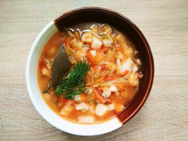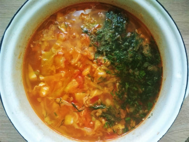 На обед сварила суп с капустой и картошкой. Готовится он очень просто и достаточно быстро. Варила супа из расчета на 3 литра воды. Вместо помидоров использовала кетчуп (примерно 2 столовые ложки).