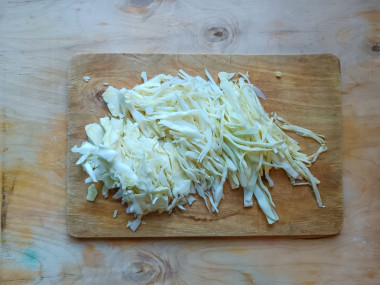 Затем добавьте капусту и лавровый лист. Варите суп около 10 минут.