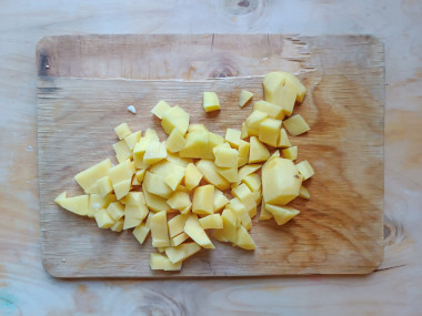 В кастрюлю налейте воду и доведите её до кипения. С выбором идеальной кастрюли для супа поможет статья о кастрюлях, ссылка в конце рецепта. В кипящую воду положите целую луковицу и нарезанный картофель. Варите около 5 минут, снимая образующуюся пену. Луковицу можно не отваривать вместе с картофелем, а нарезать и обжарить с морковью (шаг 9).