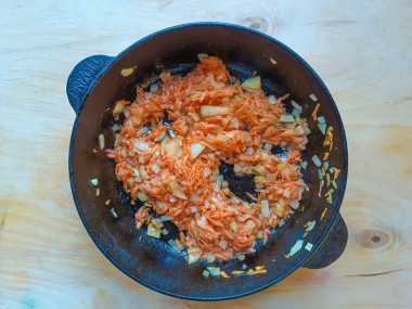 Переложите заправку в кастрюлю и перемешайте. Варите суп 5-7 минут.