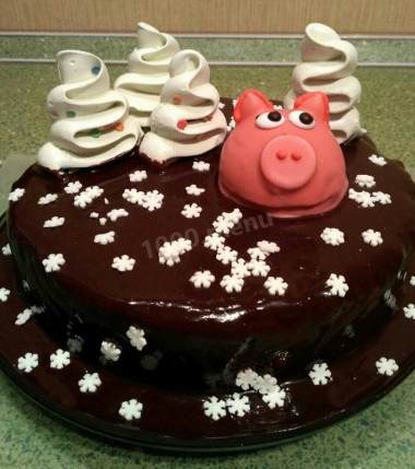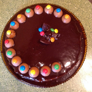 Перемешиваем до однородности погружным блендером. Затем глазурь пропускаем через сито, чтобы избежать пузырьков. Оставляем на время, даем остыть глазури до 30 градусов. Немного постояв, глазурь станет более гладкой и однородной. Покрываем торт нашей изумительной глазурью, её много получится. Верх украшаем по желанию. Мой тортик посвящен невестке Наденьке.