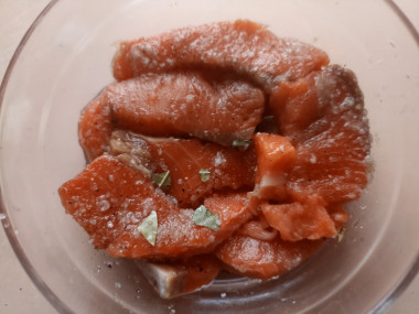 При обычном засоле можно солить как целую тушку, так и стейки, нарезанные дома или купленные в магазине. Я солила именно стейки лосося.