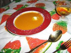 Кулинарный рецепт этого супа относится к категории домашних блюд. Очень вкусная и ароматная еда. Если вы поститесь или относитесь к вегетарианцам, то варите супчик на воде, от этого вкус не изменится. Для приготовления томатного супа с тыквой берем 700 грамм неочищенной тыквы. Затем очищаем овощ и нарезаем кубиками. На сковороде с разогретым оливковым маслом обжариваем кубики тыквы в течение 10 минут. Далее добавляем измельченные зубчики чеснока, листики розмарина, томатное пюре или мелко нарезанные свежие помидоры без кожицы. Содержимое сковороды доводим до кипения и тушим на медленном огне несколько минут. В конце приготовления разминаем тыкву толкушкой так, чтобы остались очень мелкие кусочки. В кастрюлю с кипящей водой или бульоном выкладываем содержимое сковороды, посыпаем солью и черным перцем и доводим до кипения. Разливаем супчик по тарелкам, украсив зеленью. Томатный суп с тыквой готов, приятного аппетита!