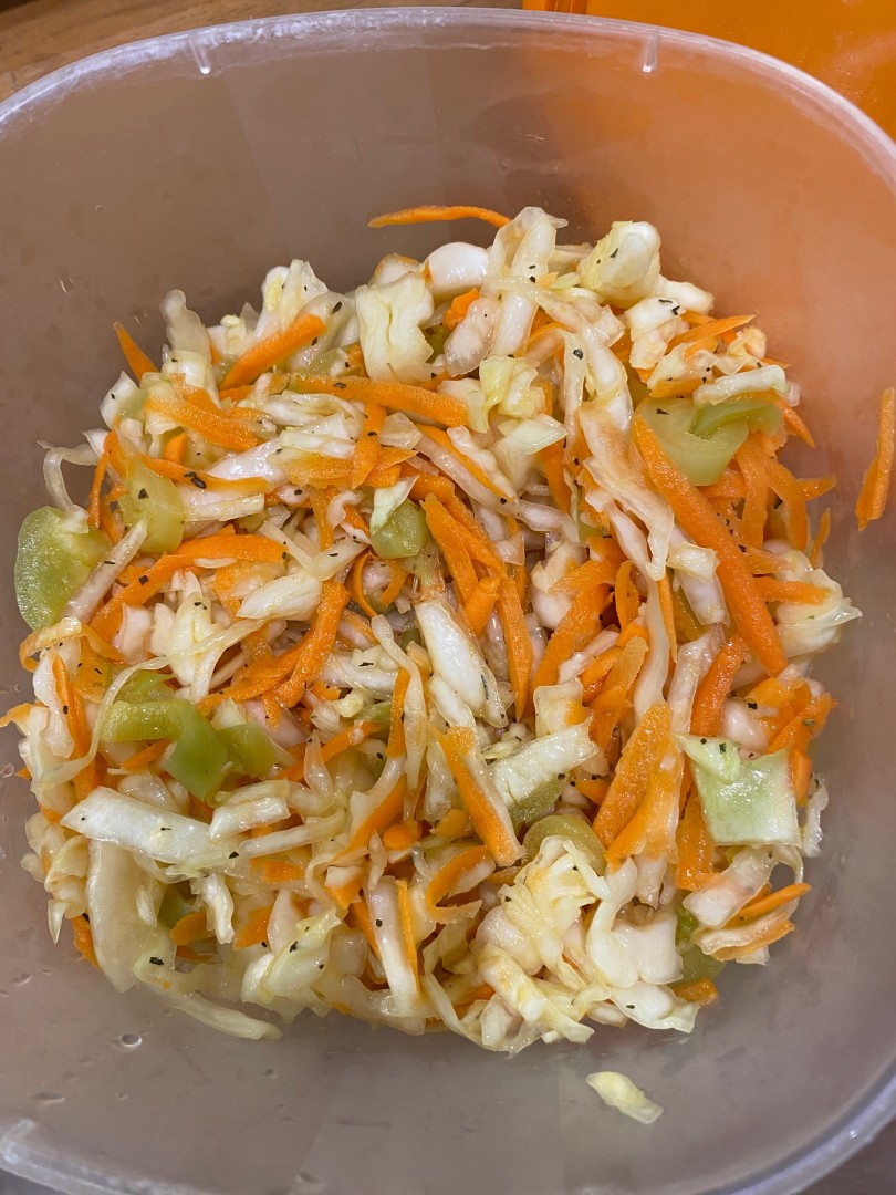 Уже второй день готовлю салаты из капусты, ведь нашла зимой кочан отличной капусты, подходящей для салатов и засолки. Ждать когда капуста засолится долго, поэтому нашла в закладках рецепт капусты провансаль быстрого приготовления. Как раз все овощи в наличии. Капусту после нарезки хорошо помяла руками, чтобы больше сока было, да и салат есть приятнее будет. Морковь натерла на крупной терке, а красный болгарский перец нарезала полукольцами. Чеснок пропустила через пресс, как я поняла таким образом он быстрее отдаст свой аромат и остроту капусте. Маринад на мой вкус идеальный, соль и сахар в достаточном количестве, уксуса не много. Салат мариновался у меня шесть часов под прессом. Капуста провансаль быстрого приготовления получилась хрустящая, очень ароматная и вкусная. Овощи хорошо пропитались и насытились маринадом. Такой салат просто идеален на ужин в качестве гарнира.