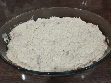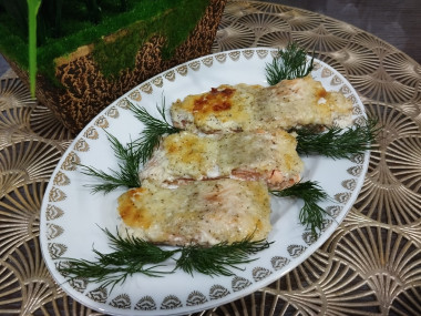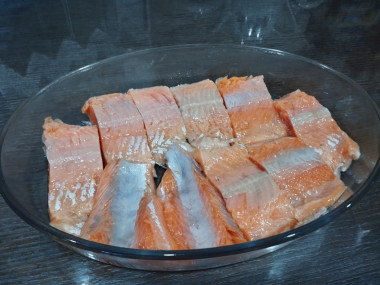 Форель нарежьте порционными кусками, выложите в форму для запекания. Можно слегка посолить, если сыр несоленый.