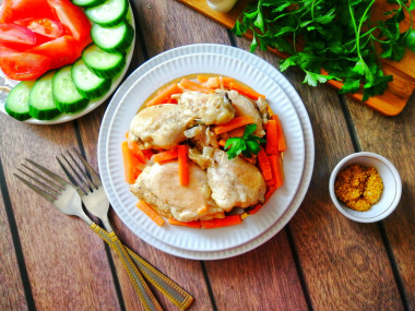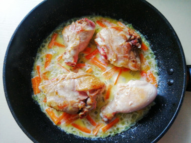 довольно-таки быстро. Два окорочка разрезала на части, удалила кожу (так курочка получается вкуснее), обжарила мясо до золотистого цвета. Затем на масле, на котором жарилась курица, обжарила лук и морковь. Добавила в зажарку сметану и немного воды (меньше чем в рецепте). Тушила курочку в образовавшемся соусе 40 минут под крышкой. Подавала с отваренным рисом.