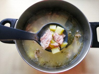 С копченых ребрышек срежьте мясо. Кости можете оставить для другого супа. Из них получится насыщенный бульон. Если варите суп не на бульоне, а на воде, то предварительно после закипания воды можете бросить в кастрюлю очищенные от мяса кости и проварить 10 минут. Так у вас получится бульон, на основе которого дальше можно варить суп.