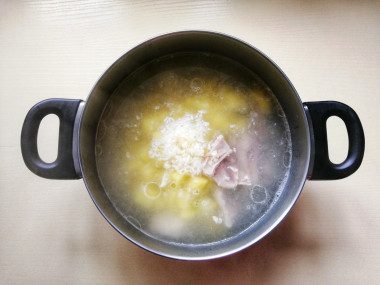 Вместо копченых свиных ребрышек взяла сырые. Сварила из них бульон, после этого вынула ребрышки из кастрюли, остудила, разрезала вдоль косточек, сняла с них мясо и переложила в кастрюлю. Добавила в бульон нарезанную картошку и натертый чеснок (взяла шесть зубчиков), варила минут 20. Из специй положила в суп базилик и лавровый лист.