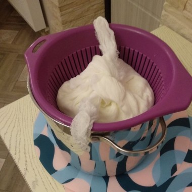 Берем высокую кастрюлю, устанавливаем на нее дуршлаг, выстилаем его марлей в 3-4 слоя и переливаем в него творожную смесь. Оставляем в прохладном месте часа на 2-3