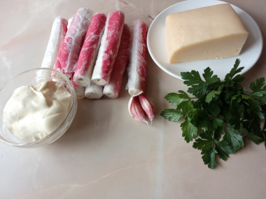 Как сделать салат из крабовых палочек, сыра, чеснока и майонеза? Подготовьте необходимые ингредиенты. О том, как правильно выбирать крабовые палочки, читайте в конце рецепта. Майонез можно сделать самостоятельно. Рецепты домашнего майонеза вы найдёте после последнего шага. Сыр для этого салата можно брать любой (Ламбер, Российский), но я больше всего люблю твердый, суховатый типа Парреджио, Грюйер. С ним вкус салата раскрывается с другой стороны.