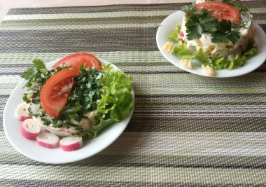 Приготовила салат крабовые палочки, сыр, чеснок. Получилось быстро,вкусно! Для будничной подачи делала порционно, не в креманках. Интересно , что чеснок добавляется в зелень, а не в майонез, как обычно. Такое сочетание получается более острым и пикантным. В то же время в отдельных порциях проще сделать верхний слой без чеснока, если нужен более диетический вариант (одну порцию я сделала просто с зеленью укропа и петрушки). Спасибо за рецепт, Мария!