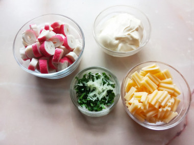 Чеснок пропустите через пресс, соедините с петрушкой и перемешайте. Чтобы салат был более нежным и однородным, сыр и крабовые палочки можно натереть на терке, а зелень и чеснок соединить с майонезом.