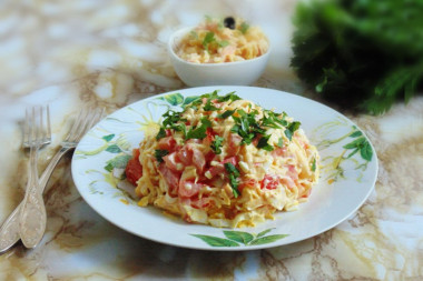 В такой салат с крабовыми палочками и сыром можно добавить помидоры. Вкусный вариант.