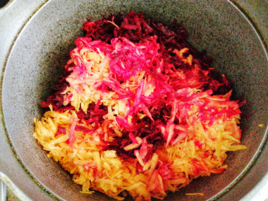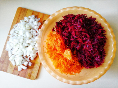 Свёклу и морковь нарежьте соломкой или другой формы, которая вам больше нравится, но не измельчайте слишком сильно, чтобы сохранить текстуру овощей. Отправьте нарезанные свёклу и морковь к обжаренному луку. Как вариант вы можете отдельно обжарить каждый овощ, а затем их соединить.