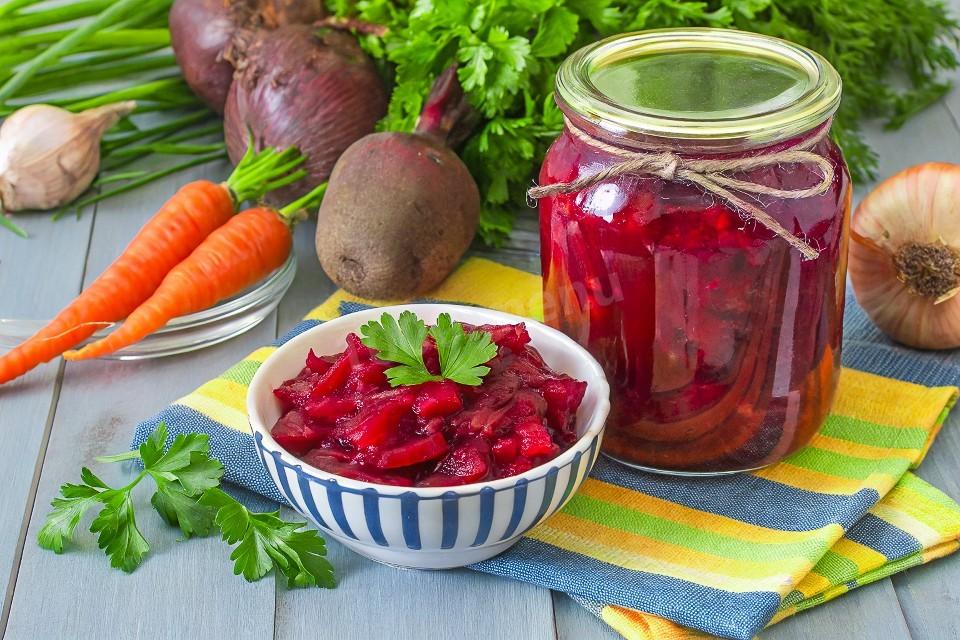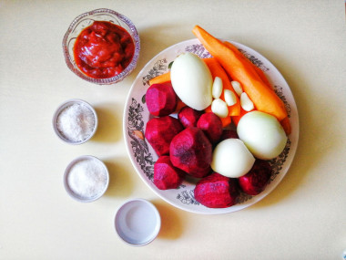 Калорийность продуктов: Морковь, Свекла, Лук, Чеснок, Томатный сок, Соль, Сахар, Специи сухие, Растительное масло, Уксус