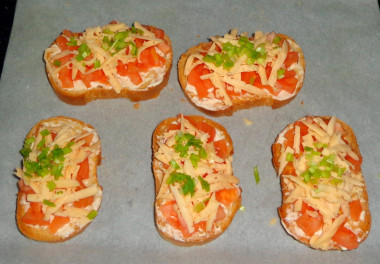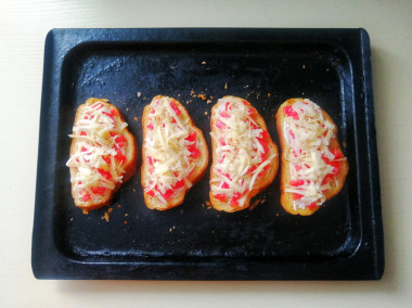 Каждый бутерброд обильно посыпьте тертым сыром. Поставьте противень в духовку ещё минут на 7-10. За это время сыр успеет расплавиться, а помидоры станут мягкие.